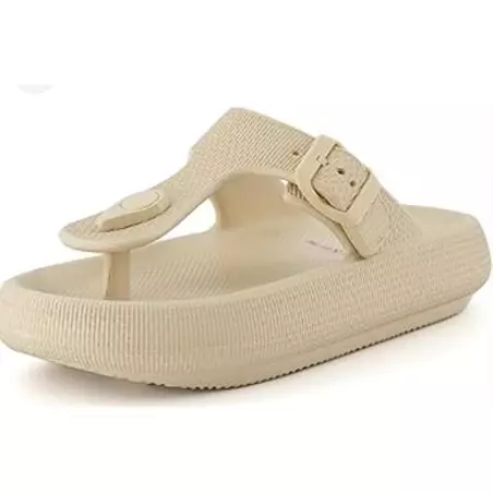 Beżowe gumowe klapki z regulowaną klamrą i wyprofilowaną wkładką . Idealne na plaże basen zapewniają wygodę i łatwość w utrzymaniu .