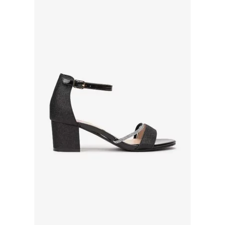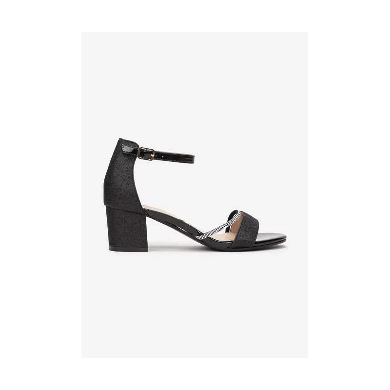 Sandały Varene wykonane z ekoskóry pokrytej brokatem, udekorowane dodatkowo paskiem z cyrkoniami przy palcach. Na niewysokim słupku, zapinane na sprzączkę.