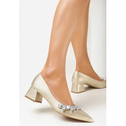 Czółenka Anani na niskim słupku. Wykonane z imitacji skóry wraz z wkładką. Szpiczaste noski ozdobione kryształkami. Eleganckie czółenka Anani idealne na każdą okazję.