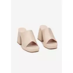 Klapki Panena z szerokim paskiem podtrzymującym stopę. Wyróżnia je szeroki, geometryczny obcas i platforma. Model z kwadratowym, otwartym noskiem. Wykonane z ekoskóry, w jednolitym kolorze. Idealne, by dopełnić look w klimacie szalonych lat 70.! Zanim dodasz do koszyka zapoznaj się z tabelą (sugerujemy wybór o 1 rozmiar większych).
