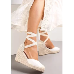 Sandały Acalea na koturnie i niskiej platformie. Fason espadryli, z jutową plecionką na bokach podeszwy i nosku. Palce i pięta zakryte. Model wiązany na długi pasek sięgający aż do łydki. Wykonane z materiału tekstylnego. Łączą w sobie kultowy fason i modne wiązanie: sprawdzą się zarówno w stylizacjach basicowych, jak i tych inspirowanych