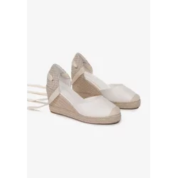 Sandały Acalea na koturnie i niskiej platformie. Fason espadryli, z jutową plecionką na bokach podeszwy i nosku. Palce i pięta zakryte. Model wiązany na długi pasek sięgający aż do łydki. Wykonane z materiału tekstylnego. Łączą w sobie kultowy fason i modne wiązanie: sprawdzą się zarówno w stylizacjach basicowych, jak i tych inspirowanych trendami. Wąskie, najlepiej leżą na smukłej stopie. Sugerujemy zakup rozmiaru o 1 większego.