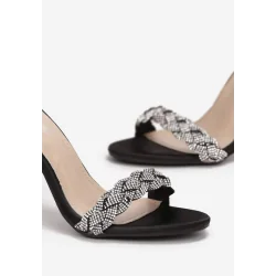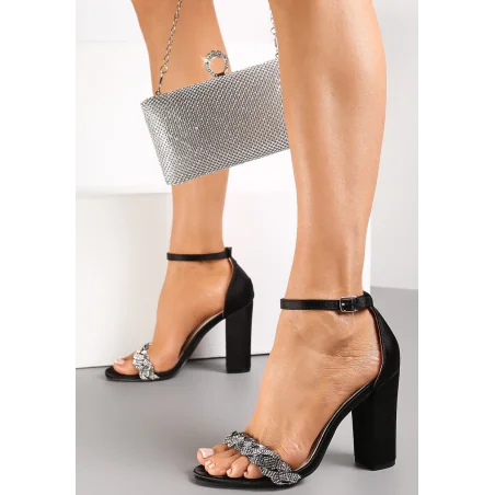 Sandały Feka w całości pokryte satynową tkaniną, z wkładką z ekologicznej skóry. Stopę podtrzymuje pasek z imitacji cyrkonii. Odkryty, okrągły nosek. Osadzone na słupkowym obcasie. Pasek wokół kostki zapinany na sprzączkę.