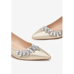 Czółenka Anani na niskim słupku. Wykonane z imitacji skóry wraz z wkładką. Szpiczaste noski ozdobione kryształkami. Eleganckie czółenka Anani idealne na każdą okazję.