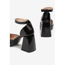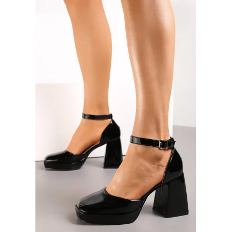 Czółenka Cosaia wykonane z lakierowanej ekoskóry, z kwadratowym noskiem i cholewką wyciętą po bokach. Osadzone na szerokim słupku i dodatkowej platformie przy palcach.