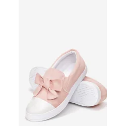 Slip On Fixation wsuwane, na płaskiej podeszwie. Podeszwa i nosek buta z białej gumy. Cholewka przed kostkę. Po bokach cholewki niewielkie gumki w dopasowanym odcieniu, które pomogą w zakładaniu. Z przodu dekoracyjna kokarda w kolorze butów. Wykonane z ekozamszu, wkładka z materiału włókienniczego. To bardzo subtelne slip on, które z