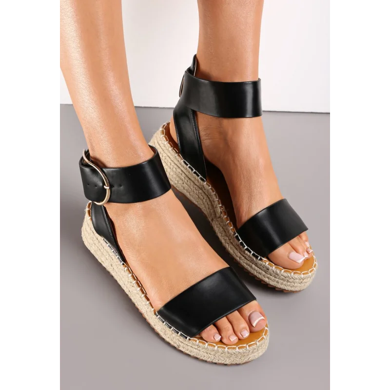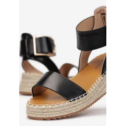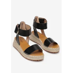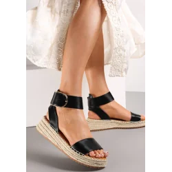 Sandały Lynnette z szerokim paskiem wokół kostki i przy palcach. Zapinane na dużą, cienką sprzączkę. Sandały w stylu boho, na plecionej platformie.