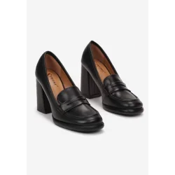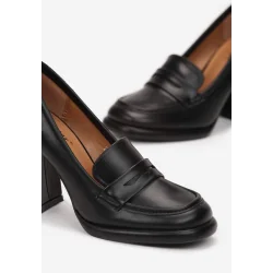 Mokasyny Carlin — wsuwane, na trapezowym słupku z ozdobnym wycięciem na przodzie.