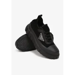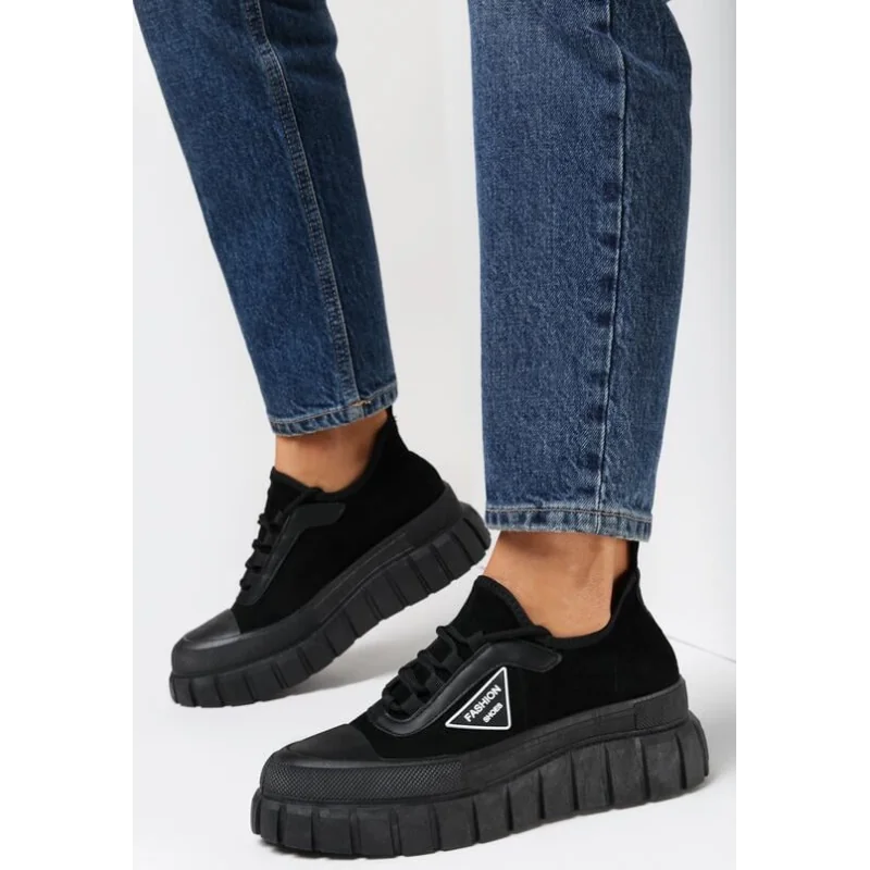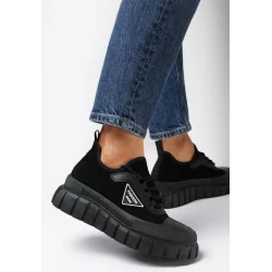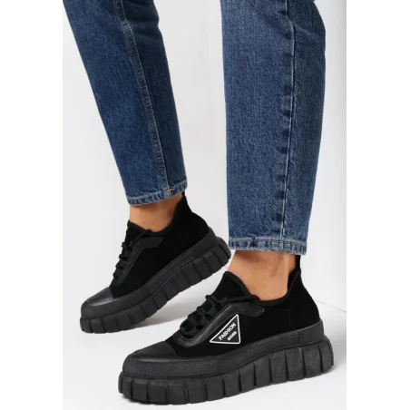 Sneakersy Nena na grubej, żłobionej platformie. Noski okrągłe, chronione gumową wstawką. Cholewka sięga przed kostkę. Wkładka z materiału. Wykonane z materiału imitującego zamsz. To wsuwane buty z dodatkowym wiązaniem, które po boku mają ozdobną naszywkę. Z tyłu na cholewkach umieszczono ozdobne tasiemki ułatwiające zakładanie. Design