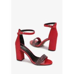Sandały Artaea na wysokim obcasie typu słupek. Model z zabudowaną piętą i odsłoniętymi palcami. Zapinane przy kostce na sprzączkę. Na palcach podwójny pasek pokryty błyszczącymi, sztucznymi kryształkami. Luźne, najlepiej leżą na szerokiej stopie. Wykonane z z połączenia ekozamszu oraz lakierowanej ekoskóry. Zakładaj je do sukienek koktajlowych albo wieczorowych kombinezonów.