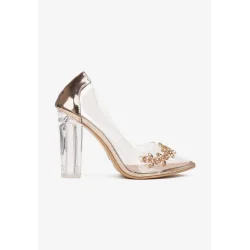 Czółenka Rumis na wysokim, przezroczystym słupku. Cholewka transparentna ze szpiczastym noskiem zdobiona wstawą z cyrkonii. Transparentne czółenka to hit sezonu!