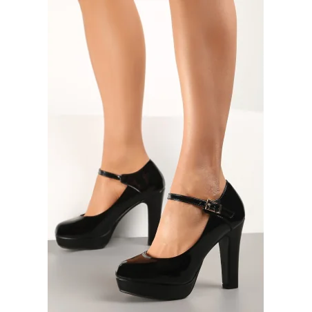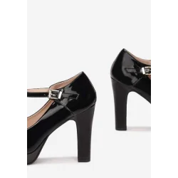 Czółenka Bena w stylu retro zapinane na pasek ze sprzączką na wysokości śródstopia. Model na wysokim słupku i platformie. Nosek okrągły. Wykonane z lakierowanej ekoskóry. Będą doskonale pasować do stylizacji z sukienką mini.