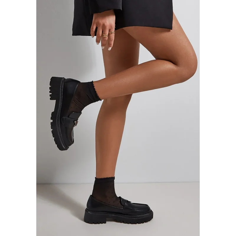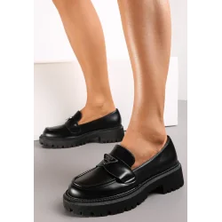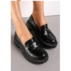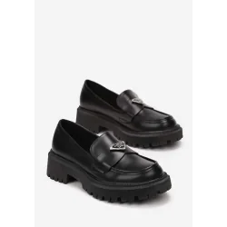 Mokasyny Silensa z modną grubą podeszwą w odcieniu cholewki. Wsuwane, przed kostkę z okrągłym noskiem. Z przodu naszyty pasek z metalowa klamerką w kształcie odwróconego trójkąta.