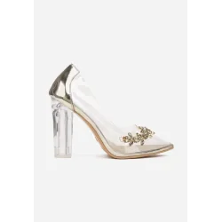Czółenka Dalzos na wysokim, transparentnym obcasie typu słupek. Cholewka także wykonana z transparentnego tworzywa, zapięte z lakierowaną wstawką. Nosek szpiczasty z ozdobą z cyrkonii z roślinnym motywem.