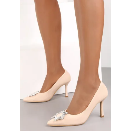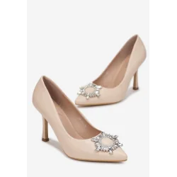Szpilki Mellyne na wysokim, powlekanym obcasie. Szpiczasty, smukły nosek. Z przodu biżuteryjna klamerka z cyrkoniami i imitacją diamentów. Wykonane z ekoskóry o gładkiej fakturze, łącznie z wkładką Wsuwane, leżą dobrze na wąskiej stopie. Wieczorowe szpilki z biżuteryjnym zdobieniem wyróżnią każdą, elegancką stylizację!