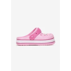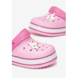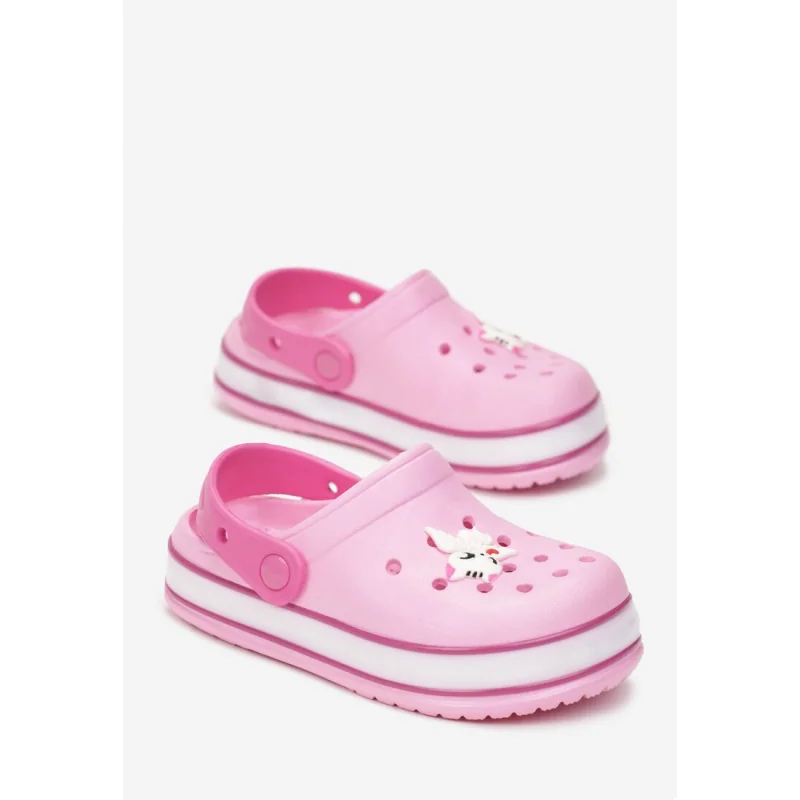 Klapki Koloise z piankowego gumowego tworzywa. Osadzone na grubej podeszwie z lampkami, wsuwane z paskiem podtrzymującym stopę, z przodu ozdobne wycięcia.