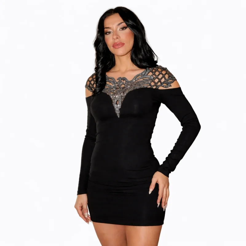Wybierz krótką czarną sukienkę z odkrytymi plecami i srebrnymi kryształkami Miss Moi rozmiar M, jeśli szukasz efektownego modelu na wyjątkowe okazje. To kobieca propozycja, która łączy elegancję z wyrazistym, zmysłowym stylem.