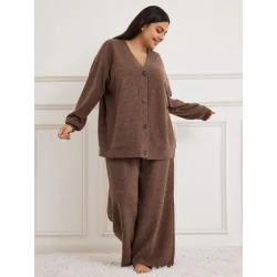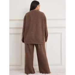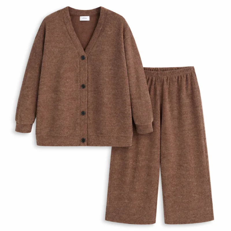 Komplet damski z dzianiny brązowy Cider rozmiar XL to stylowa propozycja dla kobiet, które cenią wygodę, spójny wygląd i modny charakter codziennych stylizacji. Dzianinowy komplet doskonale sprawdza się na co dzień, w domu, podczas wyjazdów, spacerów i luźniejszych wyjść, oferując komfort noszenia oraz estetyczny wygląd. Brązowy komplet