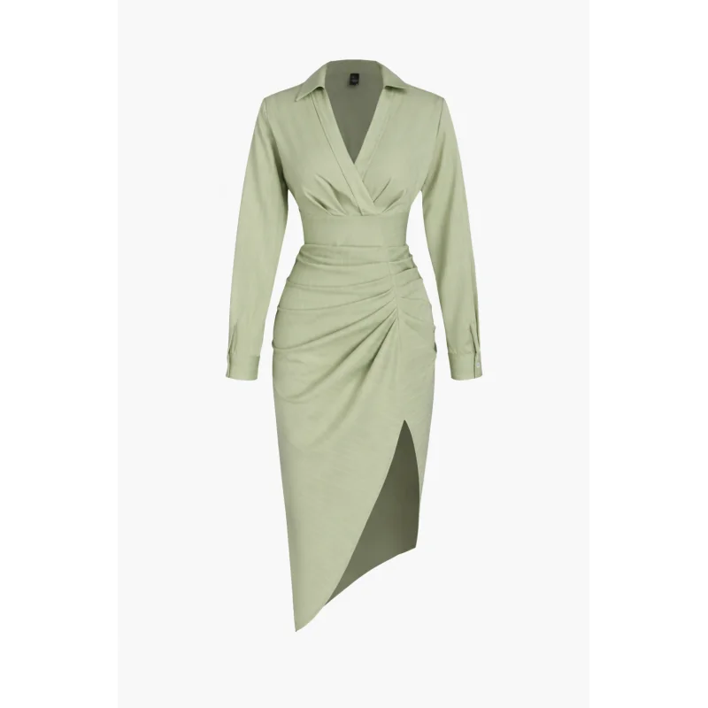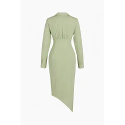Sukienka łączy długość midi, wzór w paski, marszczenia oraz rozcięcie, dzięki czemu prezentuje się modnie i efektownie.