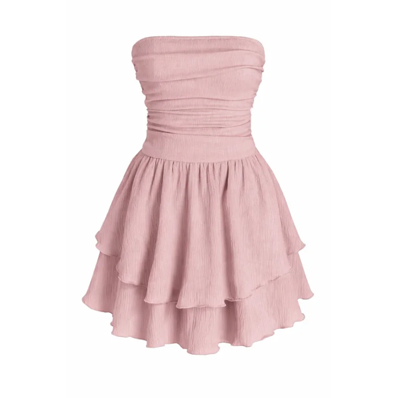 Sukienka łączy długość mini z dekoracyjnymi marszczeniami i falbanką, dzięki czemu prezentuje się lekko, nowocześnie i bardzo stylowo.