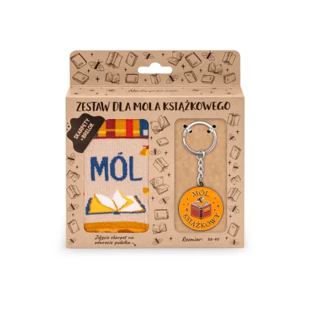 Psotnik kołatek, pustosz kradnik, rybik cukrowy - mól książkowy niejedno ma imię! Jeśli Ty również masz tendencję do żerowania w starych książkach i innych skupieniach wiekowego papieru, niewykluczone, że jesteś jednym z nich! Zestaw DLA MOLA KSIĄŻKOWEGO, w skład którego wchodzą stylowe skarpety i brelok, to idealna propozycja na prezent dla polonisty i miłośnika literatury. Jako dopełnienie upominku polecamy dobrą książkę! Skarpety: Oryginalne skarpety asymetryczne Skład: 80% najwyższej jakości bawełna czesana, 17% poliamid (dodaje wytrzymałości), 3% elastan (skarpetka lepiej dopasowuje się do stopy) Nieuciskający ściągacz i komfortowy płaski szew na palcach Wyprodukowano w Polsce Prać zawsze na lewej stronie w temperaturze maks. 40 C, nie prasować. Brelok z zawieszką do kluczy: Średnica: 4 cm Wykonany z metalu, pokryty emalią Wyprodukowano w Polsce Zestaw: Wymiary pudełka 15,5 cm x 3 cm x 17,5 cm Idealny prezent dla mola książkowego i polonisty