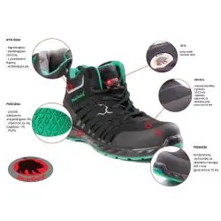 Dzięki podeszwie wykonanej z poliuretanu o podwójnej gęstości (PU/PU), trzewiki cechują się odpornością na ścieranie, elastycznością i doskonałą przyczepnością. Model PRESTON wyróżnia się nowoczesnym designem, czarną kolorystyką i dopasowaniem do naturalnego kształtu stopy. To doskonały wybór dla profesjonalistów ceniących bezpieczeństwo i wygodę w pracy.