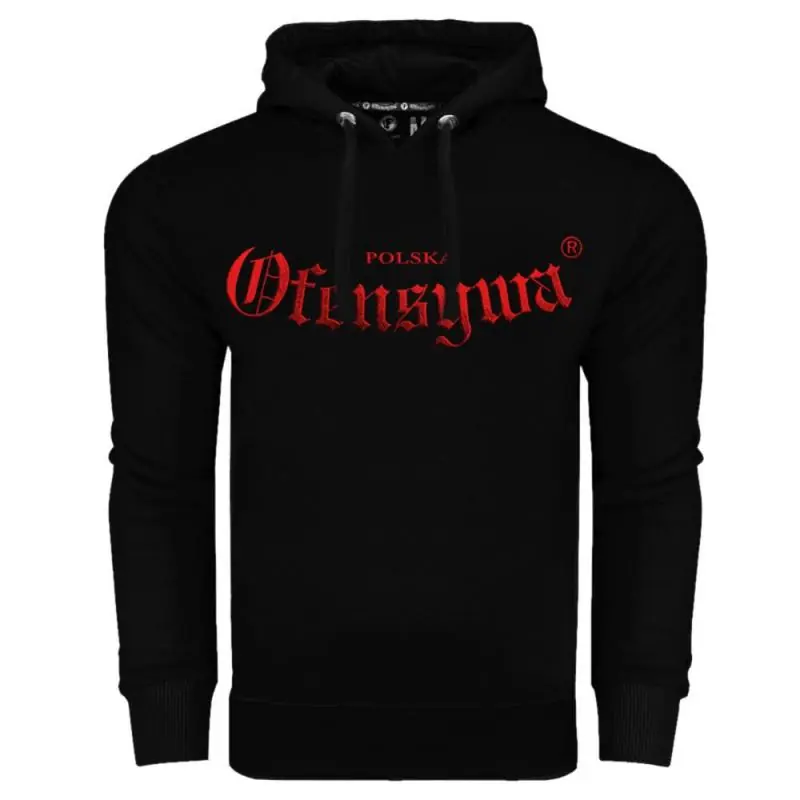 Bluza Ofensywa Gotyk czarno-czerwona z kapturem (rozmiar L) to klasyczny model typu kangurka, stworzony przez najstarszą polską markę odzieży ulicznej. Charakterystyczne gotyckie logo, masywna gramatura oraz perfekcyjne wykonanie sprawiają, że jest to bluza dla osób ceniących autentyczny streetwear i trwałość na lata.