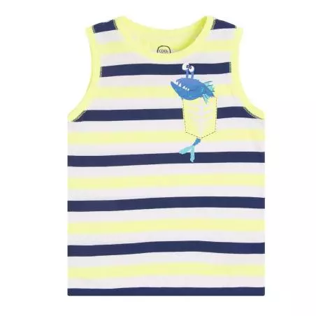 T-shirt chłopięcy bez rękawów w kolorowe paski. Koszulka na szerokich ramiączkach to doskonały pomysł na codzienną, letnią stylizację. Luźny krój oraz dobrej jakości, bawełniany materiał zapewnią dziecku komfort noszenia oraz nieograniczoną swobodę ruchów. T-shirt świetnie się nosi i doskonale wygląda w każdym zestawieniu. Załóż do