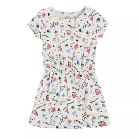 Bawełniana sukienka z krótkim rękawem i nadrukiem w letnie przysmaki to idealny wybór na wakacyjną stylizację. Prosty fason z gumką w pasie sprawdzi się zarówno w szkole, jak i na plaży.