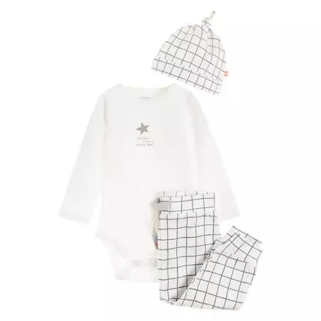 Praktyczny komplet dla niemowląt. Komplet składa się z body z długim rękawem, spodni dresowych oraz czapeczki. Body doskonale przytrzymują pieluchę i dokładnie otulają plecki dziecka, zapewniając mu ciepło podczas chłodnych dni i nocy. Jednocześnie, dzięki poręcznym zatrzaskom są niezwykle praktyczne dla rodziców. W zestawieniu z praktycznymi spodniami stanowią doskonały pomysł na codzienną stylizację.