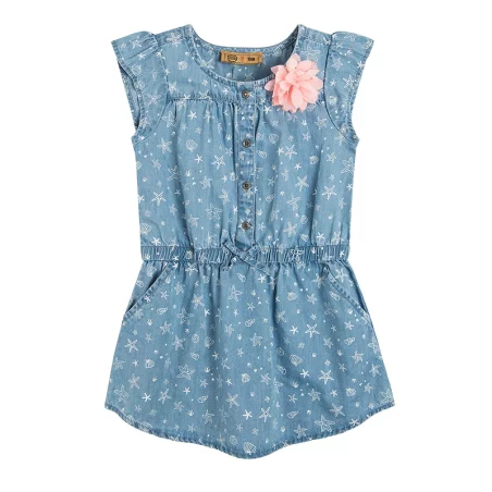 Jeansowa sukienka dla dziewczynki ze wzorem w muszelki i ozdobnym, tiulowym kwiatkiem. Ta jeansowa sukienka to doskonałe połączenie wygody z odrobiną elegancji. Sukienka doskonale odnajdzie się w codziennych stylizacjach. To idealna propozycja na upalne, letnie dni. Możemy do niej założyć obuwie sportowe, a także eleganckie sandałki.