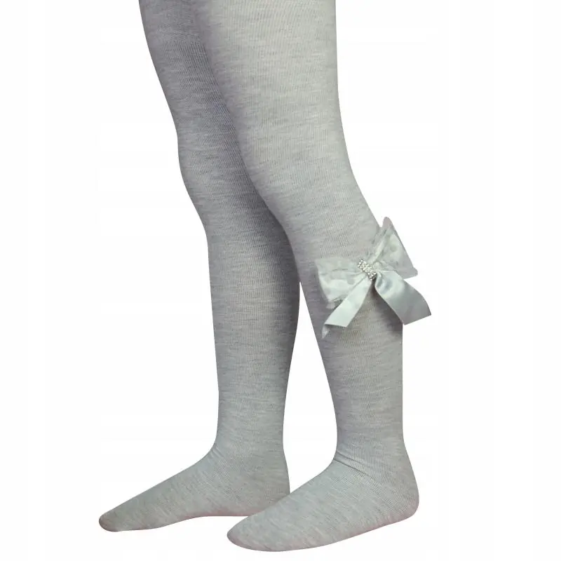 Rajstopy w kolorze ecru. Piękna duża kokardka pokryta warstwą tiulu w groszki, ozdobiona pięknie mieniącymi cyrkoniami dodaje szczególnego uroku. Takie połączenie to idealna propozycja dla małych