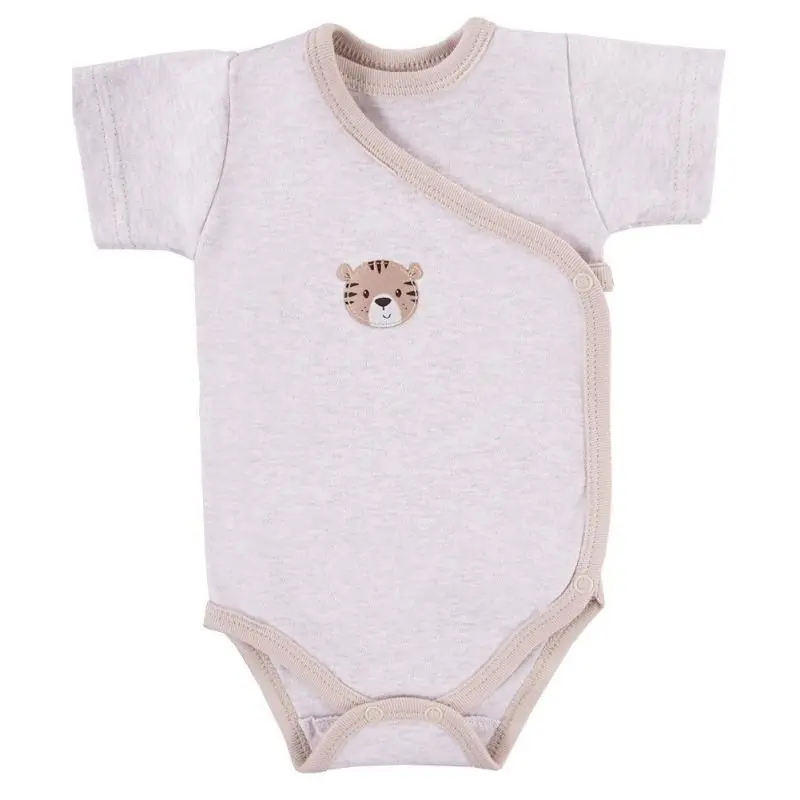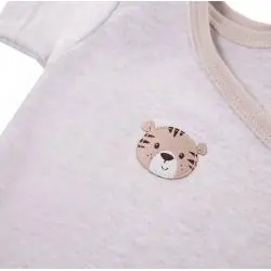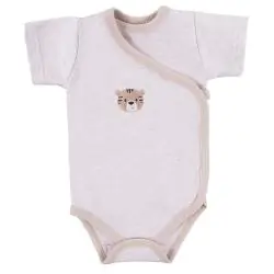 Beżowe body kopertowe niemowlęce z krótkim rękawem z kolekcji "Baby Love" uszyte z miękkiej i przyjemnej w dotyku melanżowej dzianiny bawełnianej. Z przodu bodów niemowlęcych znajduje się urocza naszywka przedstawiająca zwierzątko. Krój umożliwia całkowite rozpięcie, przez co body jest funkcjonalne i wygodne. Body wykończone miękką lamówką. Body niemowlęce idealnie sprawdzają się w pierwszych miesiącach życia dziecka i należą do najczęściej wybieranego asortymentu przez mamy.