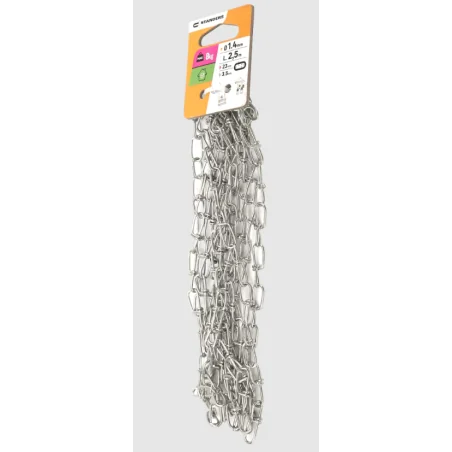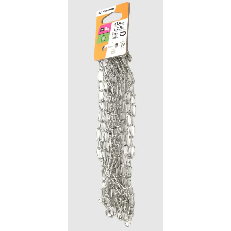 Łańcuch węzłowy 1.4 mm x 2.5 m wykonany ze stali ocynkowanej to praktyczne i trwałe rozwiązanie do wielu zastosowań. Dzięki wysokiej odporności na obciążenia oraz estetycznemu, błyszczącemu wykończeniu, sprawdzi się zarówno w zastosowaniach technicznych, jak i