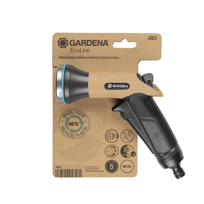 Gardena EcoLine pistolet zraszający to innowacyjne i przyjazne środowisku narzędzie do podlewania roślin, trawnika i rabat kwiatowych. Wykonany w ponad 65% z tworzyw sztucznych pochodzących z recyklingu, łączy nowoczesny design z troską o naturę. Dzięki precyzyjnej regulacji strumienia wody umożliwia dopasowanie trybu podlewania do różnych potrzeb.