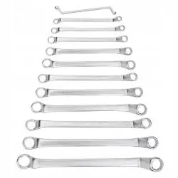 - Kompletny zestaw 12 kluczy oczkowych odgiętych – rozmiary od 6 do 32 mm