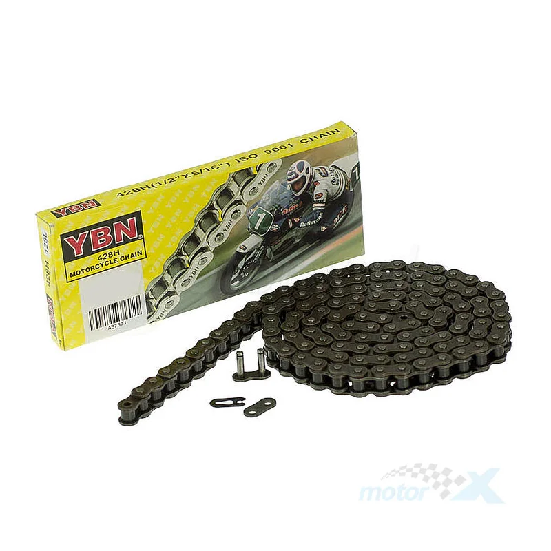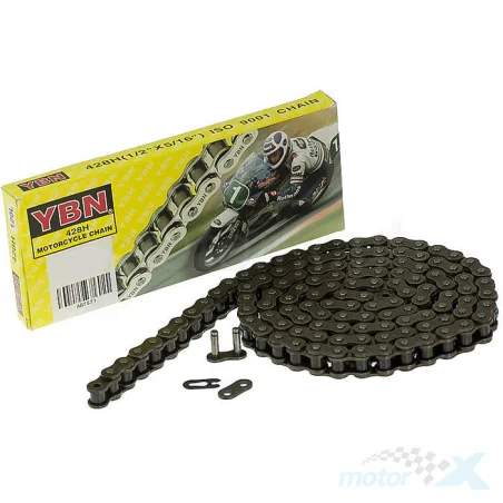 YBN 420H 130 ogniw to wytrzymały, wzmocniony łańcuch napędowy przeznaczony do motocykli, skuterów, crossów oraz quadów. Charakteryzuje się zwiększoną odpornością na rozciąganie, co przekłada się na dłuższą żywotność i większe bezpieczeństwo podczas jazdy. Odpowiedni do napędów wymagających