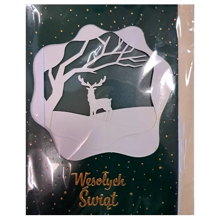 Kartka świąteczna "Wesołych Świąt z kopertą" to piękny, klasyczny świąteczny design, który roztacza atmosferę radości i ciepła. Na przedniej stronie kartki znajduje się uroczy ilustracyjny motyw związany z Bożym Narodzeniem, jak choinka, śnieg lub renifer. Całość jest w pełni kolorowa i przyciągająca wzrok.