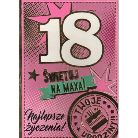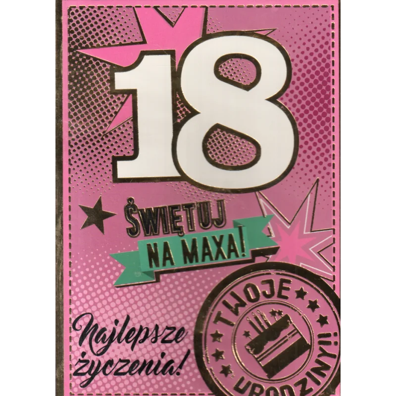 Kartka okolicznościowa z okazji 18 urodzin to doskonały dodatek do prezentu. Niesamowity karnet okolicznościowy jest pamiątką, którą można zachować na całe życie. Do karnetu okolicznościowego dołączona jest koperta, w której możesz umieścić nie tylko kartkę, ale również pieniądze lub papierowy voucher.