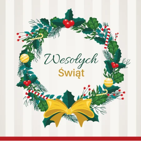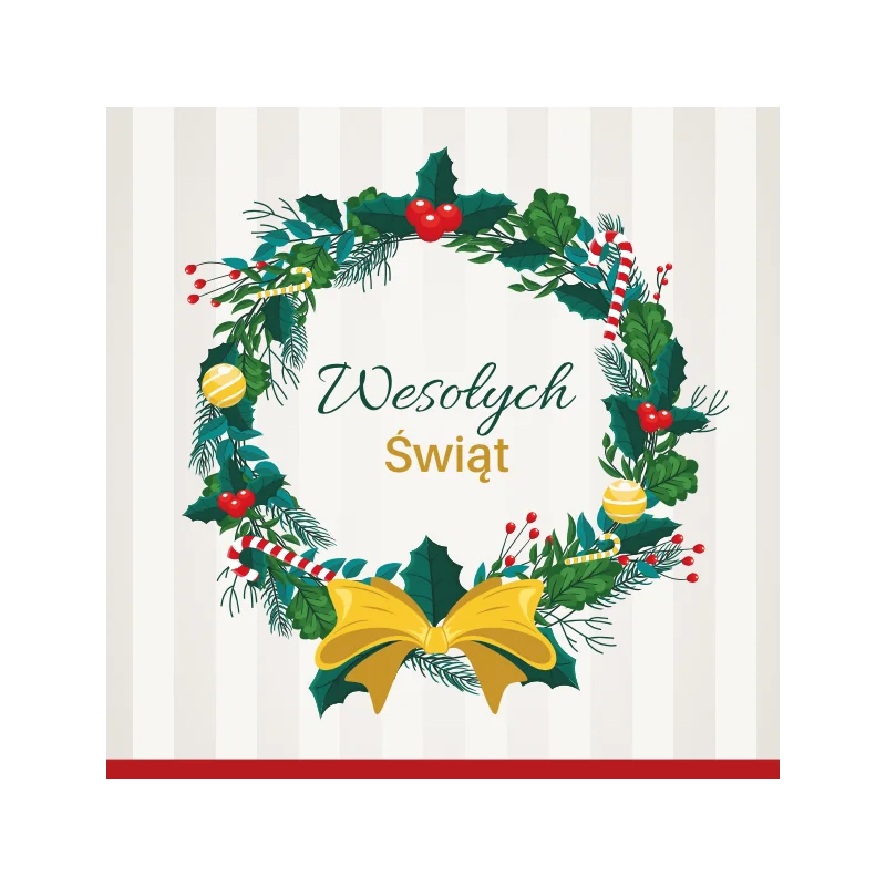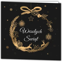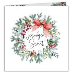 Kartka świąteczna to wspaniały sposób na złożenie życzeń pracownikom, klientom, a także bliskiej osobie. Wykonana na grubym papierze z przepiękną grafiką wieńca świątecznego oraz napisem Wesołych Świąt oczaruje każdego. Wewnątrz znajdują się zachwycające życzenia oraz miejsce na podpis. Świetnie zaprezentuje się dołączona do świątecznego prezentu.