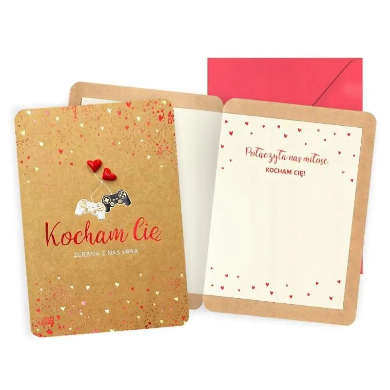 Kartka na Walentynki GamePad „Kocham Cię, zgrana para” to estetyczna i oryginalna forma wyrażenia uczuć. Czytelny przekaz, nowoczesny motyw i możliwość personalizacji sprawiają, że kartka doskonale podkreśla wyjątkowy charakter Walentynek.