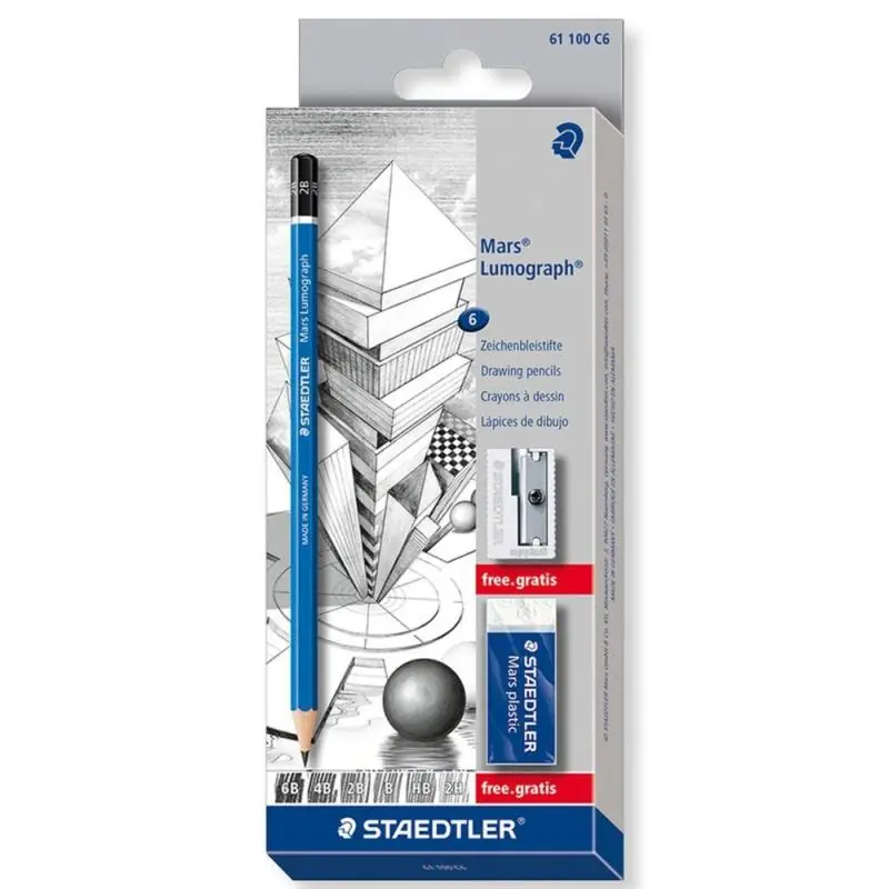 - opakowanie zawiera 6 ołówków (6B, 4B, 2B, B, HB, 2H), gumka, metalowa temperówka