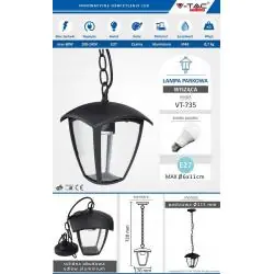 V-TAC VT-735 to stylowa, zwieszana lampa ogrodowa, zaprojektowana do pracy w warunkach zewnętrznych. Dzięki solidnej aluminiowej obudowie, klasie ochrony IP65 i standardowemu gwintowi E27 stanowi idealny zamiennik tradycyjnych opraw, łącząc elegancki design z niezawodnością i oszczędnością energii.