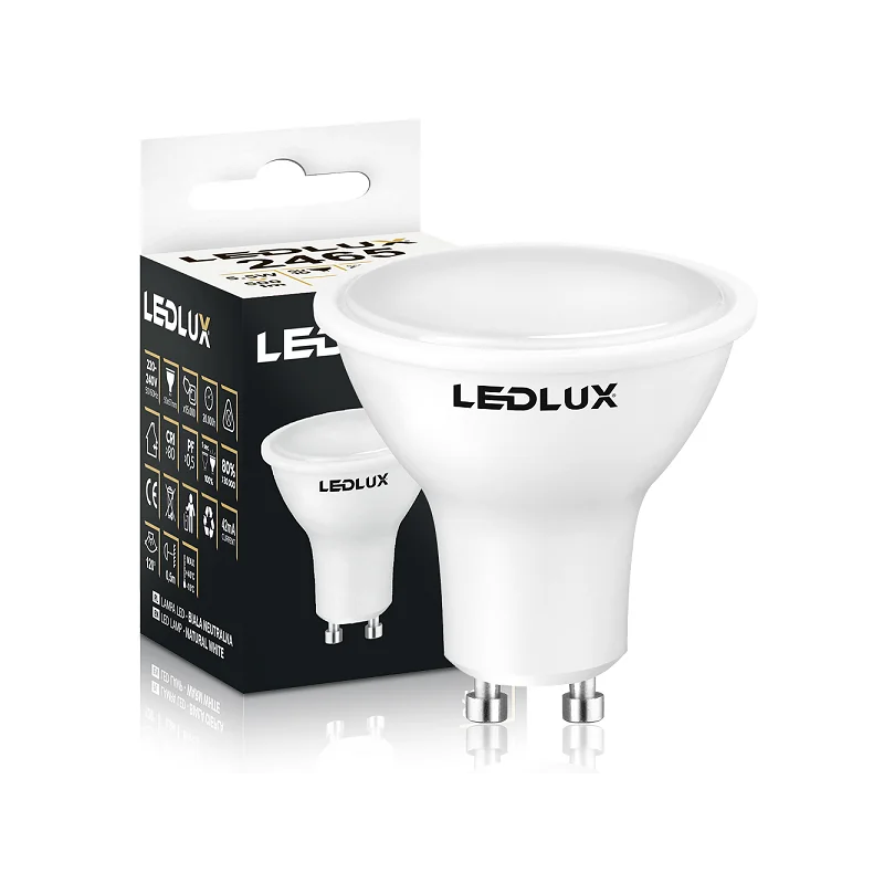 Żarówka LED GU10 5,5W 4000K marki LEDLUX to energooszczędne źródło światła o barwie neutralnej, odpowiadające tradycyjnej żarówce halogenowej 50W. Dzięki zastosowaniu nowoczesnych diod SMD zapewnia wysoką wydajność świetlną i długą żywotność. Idealna do oświetlenia domowego, biurowego i komercyjnego.