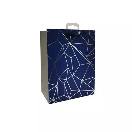 estetyczna torba prezentowa kolekcja dla mężczyzn na każdą okazję w kolorze granatowym ozdobiona srebrnym motywem uchwyt wykonany z granatowej tasiemki rozmiar S wymiary: 17x25x10cm gramatura: 210 g/m2
