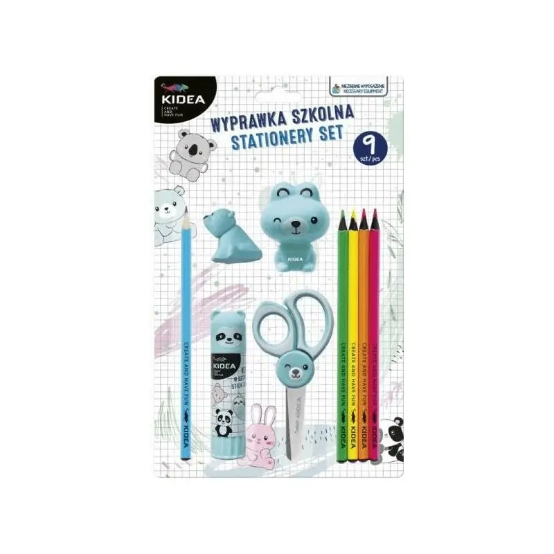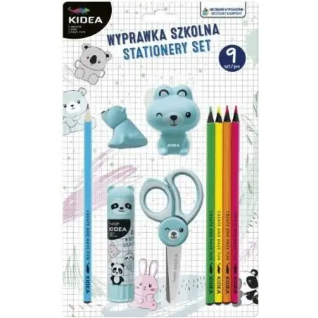 KIDEA Wyprawka Szkolna 9 elementów – zestaw Miś Mięta to idealne rozwiązanie dla najmłodszych uczniów, którzy rozpoczynają swoją przygodę ze szkołą. Starannie dobrany komplet akcesoriów łączy w sobie funkcjonalność, bezpieczeństwo i uroczy design, który przypadnie do gustu