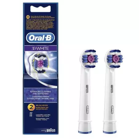 Działanie wymiennej końcówki 3D White oparto na zaawansowanej technologii czyszczenia, która ułatwia uzyskanie śnieżnobiałego uśmiechu. Końcówka ta została wyposażona w specjalnie zaprojektowaną nasadkę polerującą, która delikatnie usuwa przebarwienia, dając efekt wyraźnie bielszych zębów. Usuwa przebarwienia powierzchniowe tak skutecznie, że umożliwia wybielenie zębów w zaledwie 2 tygodnie