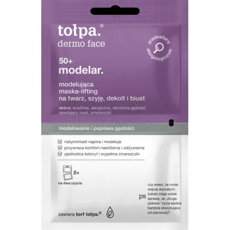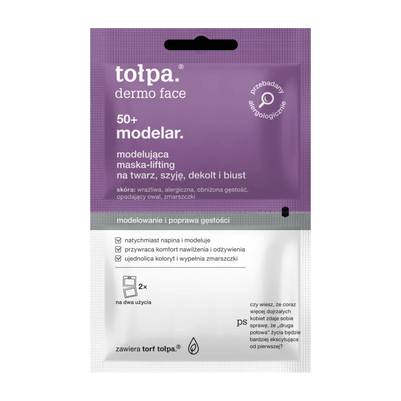 Maska-lifting Tołpa Modelar 50+ łączy intensywne działanie odmładzające z efektem modelowania owalu twarzy i poprawy wyglądu szyi, dekoltu i biustu. Regularne stosowanie przywraca jędrność, gęstość i komfort skóry, jednocześnie dbając o jej naturalne nawilżenie i regenerację. Produkt sprawia, że skóra wygląda młodziej i promiennie.