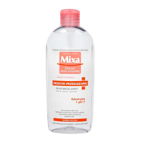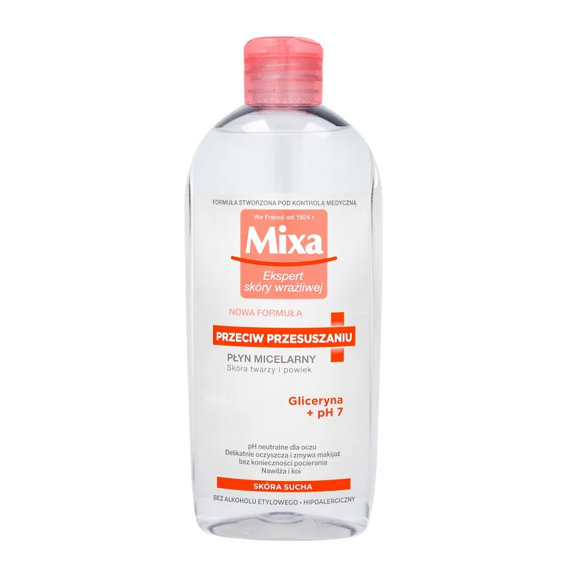 Płyn micelarny Mixa przeciw przesuszaniu skóry suchej to idealny produkt do codziennego oczyszczania twarzy i powiek. Usuwa makijaż i zanieczyszczenia skutecznie, ale delikatnie, chroniąc naturalną barierę ochronną skóry. Zawartość gliceryny zapewnia intensywne nawilżenie i ukojenie, pozostawiając skórę miękką, świeżą i przyjemną w dotyku. Produkt jest szczególnie polecany dla osób z wrażliwą skórą, które potrzebują skutecznego, a zarazem delikatnego demakijażu.