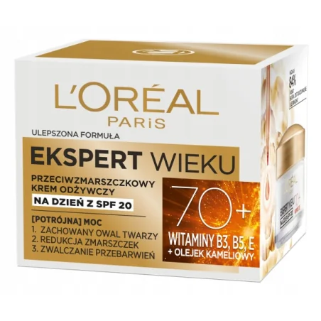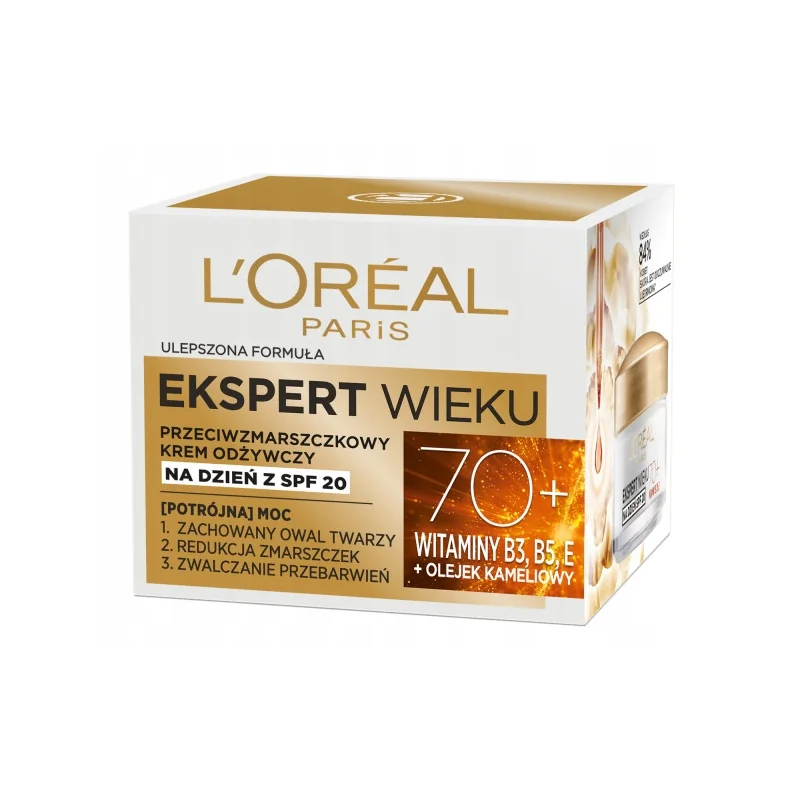 Krem L’Oreal Paris Ekspert Wieku 70+ zapewnia codzienną pielęgnację skóry dojrzałej, poprawiając jej jędrność i elastyczność. Regularne stosowanie redukuje widoczność zmarszczek, przywraca gęstość oraz rozjaśnia przebarwienia, a lekkie satynowe wykończenie pozostawia skórę miękką i komfortową. Efekt końcowy: zdrowa, odżywiona i promienna skóra każdego dnia.